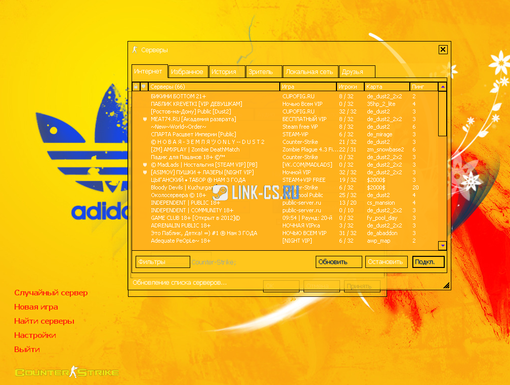 Модели оружия разработчики не стали видоизменять «с ног до головы», ведь задача была другая — придать известный стиль вооружению. С этой задачей создатели CS 1.6 Адидас справились отлично — логотип бренда, который изготовляет одежду по всему миру, есть на каждой «пушке». А вот что касаемо самих персонажей, здесь изменения более глобальные. Могли ли вы раньше представить себе спецназ в спортивных костюмах от Adidas? Именно такое «зрелище» вам и придется наблюдать в игровом проекте. Конечно, кто-то может сказать, что спортивные костюмы в военном шутере — это откровенный перебор. Но ничего отрицательного в столь необычных изменениях мы не видим. Скачать КС 1.6 Адидас или нет, решать уже вам. Однозначно можно сказать, кто уже нагляделся на однотипные сборки все же выбирает ту версию, которая кардинально выделяется среди масс, а не какими-то мелочами. Еще один небольшой плюс игры — перезарядка оружия. Выглядит данный процесс теперь достаточно дерзко. Поскольку игрок будет в буквальном смысле выкидывать обойму, а не класть ее в дальний карман. Плюс сам процесс перезарядка благодаря анимации проходит несколько быстрее. На перчатках также будет бренд Adidas. Так как перчатки у нас постоянно перед глазами, очень даже хорошо, что данный элемент разработчики решили не игнорировать. Из других характеристик можно отметить, что в сборку установлен новейший протектор, любые попытки взлома будут заблокированы, а сетмастер от известного мониторинга находит сотни серверов в поиске.